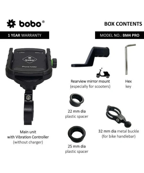 - BOBO BM4 WITH VIBRATION CONTROLLER - If you are looking for a compact yet secure bike mount for your mobile phone, this is what you should get. Jaws expand to fit a wide range of phones from 4.0 - 7.0 inch screen, while keeping all of your buttons and ports accessible. Vibration Controller helps dampen the vibrations to your phone.