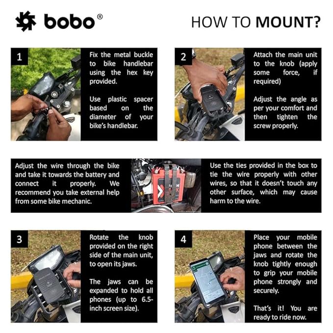 - BOBO BM6 JAW-GRIP SECURITY - If you are looking for a compact yet secure bike mount for your mobile phone, this is what you should get. Jaw-Grip expands to fit a wide range of phones from 4.0 - 7.0 inch screen, while keeping all of your buttons and ports accessible.
