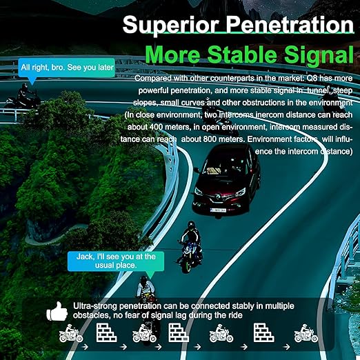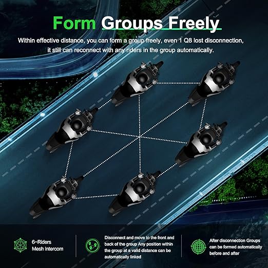 - [6-Rider Mesh Intercom]: EJEAS Q8 motorcycle bluetooth headset adopts the new mesh 3.0 technology to achieve 6 people real-time talking simultaneously, which has more powerful penetration and stable signal. It can set up a mesh group freely, and can also automatically disconnect or reconnect when leaving and entering the valid range. The Q8 mesh intercom distance can reach about 600-1000M.